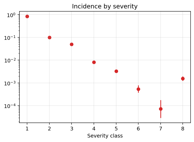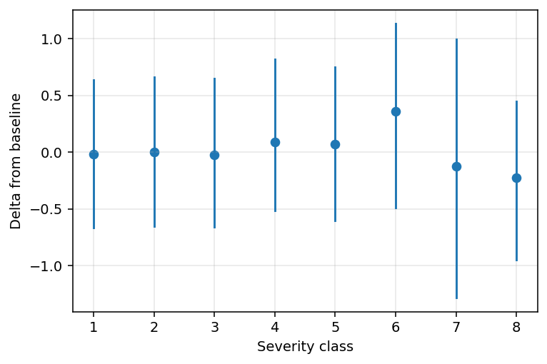 On a less speculative ground, we can notice how the uncertainty bounds around our point estimates basically disappear, except for the severity classes 6 and 7, which are indeed very rare in the dataset.