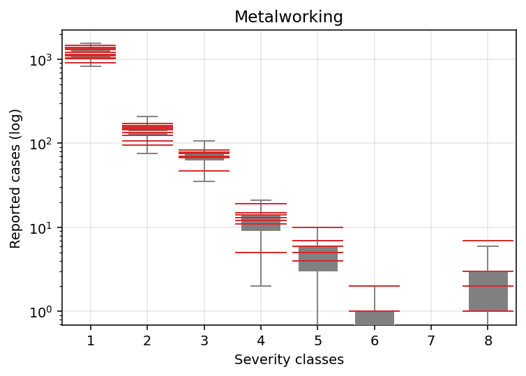 So, for this very basic exercise I will be looking only at sub-sectors and injury severity. This last one I aggregated into 8 categories ranging from “just rest at home for some days” to death4. I will also consider the process fixed over time for two reasons: I only have one yearly observation per subsector and in the aggregate both the number of workers and the number of reported injuries looks very stable.