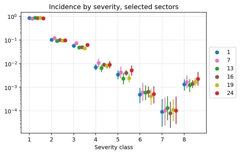 This is a little Greek galore, but the underlying idea is the same as the partial pooling we used for the h values. The idea is that, for each severity class, we allow sectors to have different incidences, but they all share a grand mean.